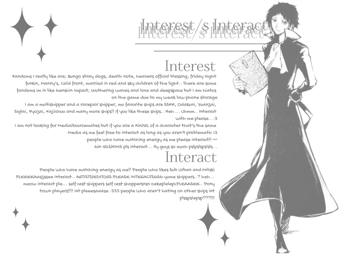 Len <33, Kc, Kazu, Mystic, Inkcap, Ren, Muse, Stacey, Gliderzz, Ashes, Ray/Ash, Kaiv, Silly geese